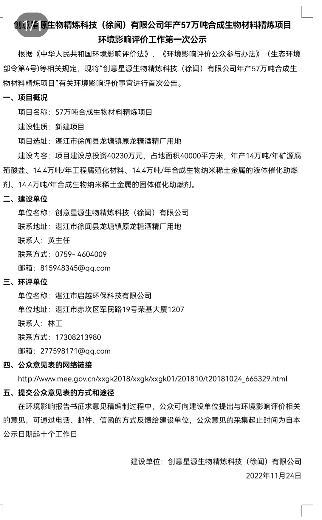 創意星源(徐聞)合成生物材料精煉項目環(huán)評公示
